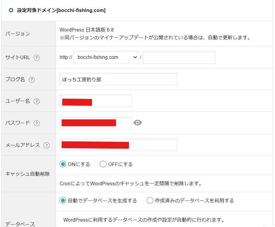 もしすでに自分でエックスサーバー上でデータベースを用意している場合は、もう一方を選択します。
