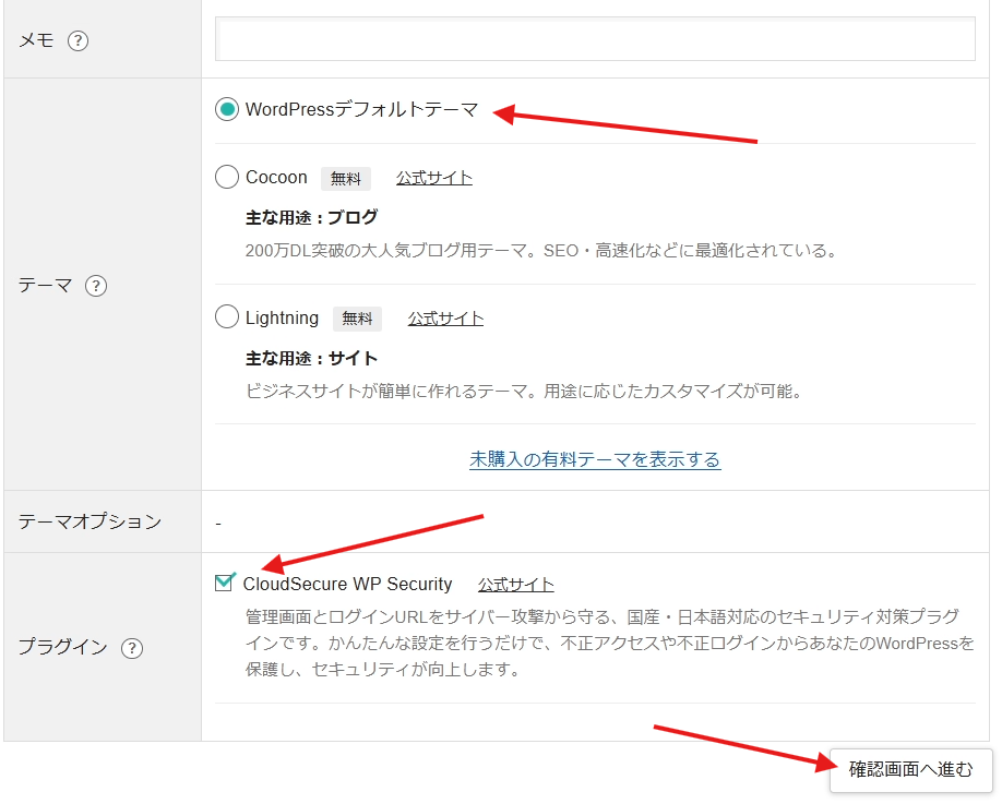 CloudSecure WP Securityプラグインにチェックを入れて(入れなくてもいい)、「確認画面へ進む」ボタンをクリックします。