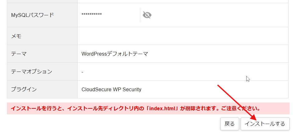 「インストールを行うと、インストール先ディレクトリ内の「index.html」が削除されます。ご注意ください。」という真っ赤な注意書きがあります。