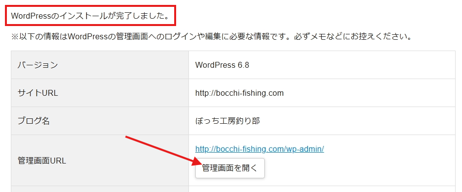 「管理画面を開く」をクリックしてWordPressの管理画面をブラウザで開きます。