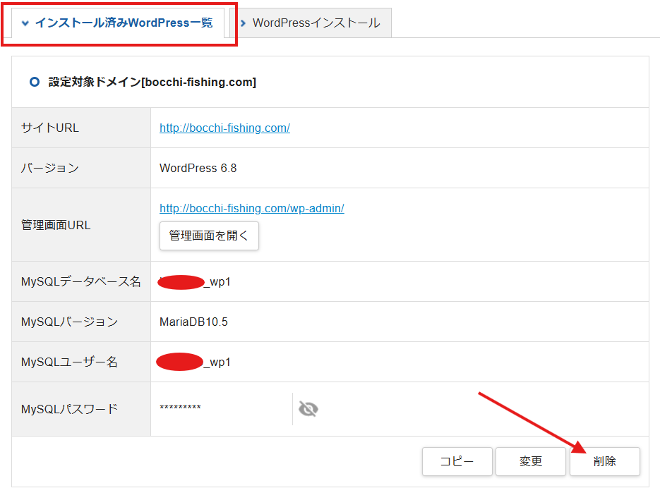 インストール済みWordPress一覧から削除するWordPressを選択します。